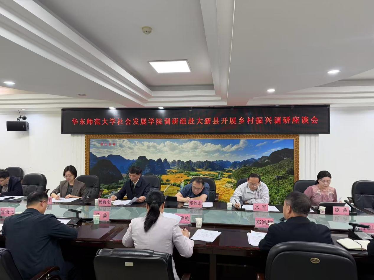 院长、人工智能与城乡融合发展研究中心执行主任文军,副书记兼副院长、人工智能与城乡融合发展研究中心秘书长庞荣,社会学系副系主任、人工智能与城乡融合发展研究中心副秘书长吴越菲等赴广西崇左市大新县开展实地调研。广西农业农村厅党组成员、自治区乡村振兴外资项目发展中心主任邓妙宏,自治区乡村振兴外资项目发展中心项目管理处处长陆汉玄等领导陪同调研。